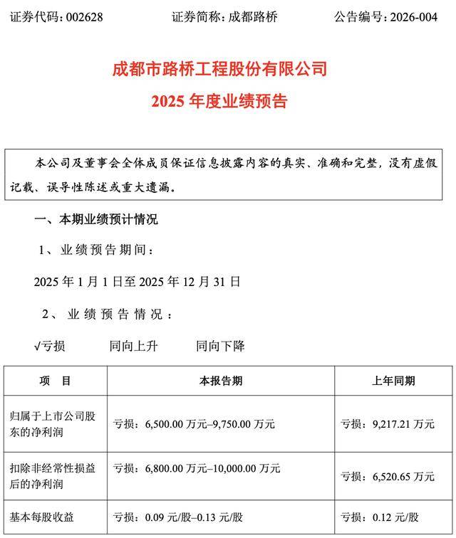 成都路桥发预亏,预计2025年度归母净亏损6500万元–9750万元