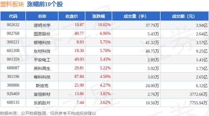 Market Overview - The plastic sector increased by 1.61% on October 21, with Daoming Optics leading the gains [1] - The Shanghai Composite Index closed at 3916.33, up 1.36%, while the Shenzhen Component Index closed at 13077.32, up 2.06% [1]   Top Gainers in the Plastic Sector - Daoming Optics (002632) closed at 10.87, up 10.02% with a trading volume of 377,900 shares and a turnover of 394 million yuan [1] - Tuen Co., Ltd. (002768) closed at 49.77, up 6.96% with a trading volume of 54,300 shares and a turnover of 264 million yuan [1] - Yinhai Technology (300221) closed at 8.83, up 5.75% with a trading volume of 413,200 shares and a turnover of 357 million yuan [1]   Decliners in the Plastic Sector - Cangzhou Mingzhu (002108) closed at 4.31, down 2.93% with a trading volume of 1,846,100 shares and a turnover of 795 million yuan [2] - Xiangyuan New Materials (300980) closed at 29.59, down 2.50% with a trading volume of 90,400 shares and a turnover of 269 million yuan [2] - Nanjing Jinglong (300644) closed at 32.01, down 2.38% with a trading volume of 35,600 shares and a turnover of 114 million yuan [2]   Capital Flow Analysis - The plastic sector saw a net inflow of 83.05 million yuan from main funds, while retail funds had a net inflow of 27.22 million yuan [2] - The main funds showed a significant net outflow from Daoming Optics, amounting to 41.34 million yuan [3] - Dongcai Technology (601208) experienced a net inflow of 98.74 million yuan from main funds, indicating strong institutional interest [3]