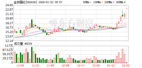 证券时报·数据宝统计,两融数据来看,该股最新(1月22日)两融余额为4.83亿元,其中,融资余额 4.83亿元,较前一个交易日减少2507.27万元,环比下降4.94%,近7日累计增加1.20亿元,环比增长 33.07%。 金安国纪再度涨停,7个交易日内录得4个涨停,累计涨幅为56.28%,累计换手率为47.02%。截至9:33, 该股今日成交量3245.77万股,成交金额8.11亿元,换手率4.48%。最新A股总市值达186.59亿元,A股流 通市值185.64亿元。 | 日期 | 当日涨跌幅(%) | 换手率(%) | 主力资金净流入(万元) | | --- | --- | --- | --- | | 2026.01.22 | 10.01 | 0.93 | 9273.89 | | 2026.01.21 | 3.22 | 7.99 | 2964.77 | | 2026.01.20 | 0.74 | 13.01 | -15708.33 | | 2026.01.19 | 9.99 | 4.23 | 19863.05 | | 2026.01.16 | 2.66 | 9.76 | 10302.92 | | 2026 ...