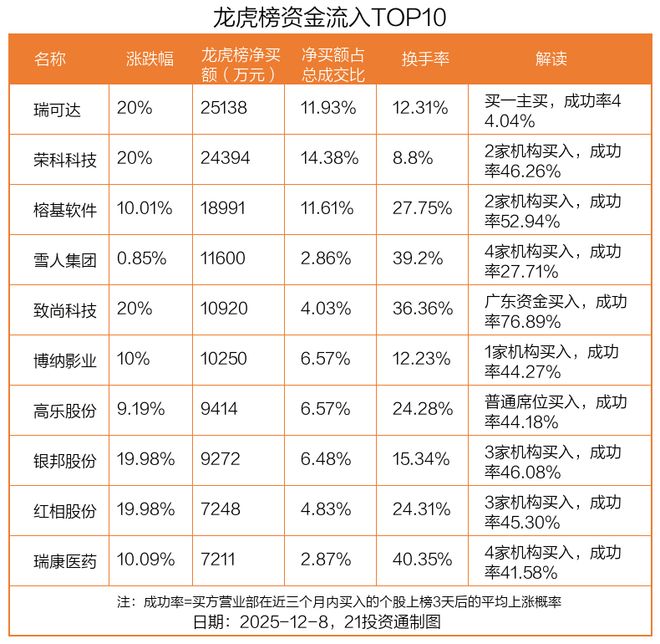| 名称 | 涨跌幅 | 戊席榜净买 | 净买额占 | | | | --- | --- | --- | --- | --- | --- | | | | 额(万元 | 总成交比 | | | | 瑞可达 | 20% | 25138 | 11.93% | 12.31% | 买一主买,成功率4 | | | | | | | 4.04% | | 荣科科技 | 20% | 24394 | 14.38% | 8.8% | 2家机构买入,成功 | | | | | | | 率46.26% | | 榕墓软件 | 10.01% | 18991 | 11.61% | 27.75% | 2家机构买入,成功 | | | | | | | 率52.94% | | 雪人集团 | 0.85% | 11600 | 2.86% | 39.2% | 4家机构买入,成功 | | | | | | | 率27.71% | | 致尚科技 | 20% | 10920 | 4.03% | 36.36% | 广东资金买入,成功 | | | | | | | 率76.89% | | 博纳影业 | 10% | 10250 | 6.57% | 12.23% | 1家机构买入 ...