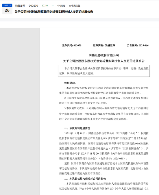 Group 1 - The core point of the news is the significant progress in the change of the actual controller of Guosheng Securities, with the Jiangxi Provincial State-owned Assets Supervision and Administration Commission (SASAC) taking over from the Jiangxi Provincial Department of Transportation [1][5] - On December 25, Guosheng Securities announced that a non-compensatory transfer agreement regarding the equity transfer of Jiangxi Transportation Investment Group Co., Ltd. (Jiangxi Jiao Tou) was signed, indicating a shift in control [1][5] - After the transfer, Jiangxi Jiao Tou will still be the controlling shareholder of Guosheng Securities, but the actual controller will change to Jiangxi SASAC [1][5] Group 2 - Guosheng Securities emphasized that the change in the controlling shareholder and actual controller is in accordance with government-approved procedures and will not significantly impact the company's governance or operations [5] - Prior to this, on November 19, Guosheng Securities had already issued a notice regarding the planned transfer of 90% of Jiangxi Jiao Tou's shares directly to Jiangxi SASAC [5] - Before the transfer, Jiangxi Jiao Tou held 494 million shares of Guosheng Securities, accounting for 25.52% of the total share capital, and through Jiangxi Ganyue Expressway Co., Ltd., it indirectly held an additional 78.5 million shares [5] Group 3 - Guosheng Securities is the only securities company under Jiangxi Province and is listed on the Shenzhen Stock Exchange, with a registered capital of 1.935 billion yuan and total assets of 48.8 billion yuan as of September 30, 2025 [6] - The change in actual controller is part of a broader trend of local state-owned asset integration, with Guosheng Securities undergoing significant identity restructuring throughout the year [6] - The company has recently completed a name change and other administrative updates, reflecting its new identity in the industry [6] Group 4 - Financial commentators suggest that the change in actual controller will help optimize the equity structure and improve resource coordination, enhancing the company's competitiveness and decision-making efficiency [7] - The transition is viewed as a vertical optimization adjustment within the same provincial state-owned asset system, maintaining the state-owned nature of the controlling stake [7] - Although there may be a transitional period for governance adaptation, the long-term outlook is positive for the company's core competitiveness and industry position, with a focus on enhancing capital operation efficiency and resource integration [7]