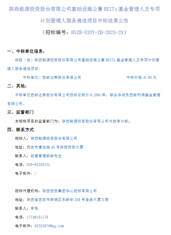 Group 1 - The winning bid for the infrastructure public REITs fund management and special plan management service selection project by Shaanxi Energy Investment Co., Ltd. was awarded to Western Securities Co., Ltd. [1] - The bid price quoted by Western Securities Co., Ltd. is 0.20% per year, with a total bid amount of 0.00 yuan [1] - The project is supervised by the internal control audit department of Shaanxi Energy Investment Co., Ltd. [1] Group 2 - The contact information for the bidding party includes Shaanxi Energy Investment Co., Ltd. located at No. 45 Tangyan Road, Xi'an, and the contact person is Mr. Yu from the management department [1] - The bidding agency is Shaanxi Investment Group Huashan Bidding Co., Ltd., located at No. 258 Dongxin Street, Xi'an, with Mr. Li Yang as the contact person [1]