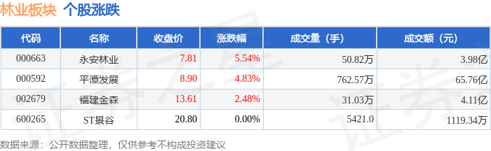 Core Insights - The forestry sector experienced a significant increase of 4.06% on November 7, with Yong'an Forestry leading the gains [1] - The Shanghai Composite Index closed at 3997.56, down 0.25%, while the Shenzhen Component Index closed at 13404.06, down 0.36% [1] Sector Performance - Yong'an Forestry (000663) closed at 7.81, up 5.54% with a trading volume of 508,200 shares and a transaction value of 398 million [1] - Pingtan Development (000592) closed at 8.90, up 4.83% with a trading volume of 7,625,700 shares and a transaction value of 657.6 million [1] - Fujian Jinsen (002679) closed at 13.61, up 2.48% with a trading volume of 310,300 shares and a transaction value of 411 million [1] - ST Jinggu (600265) remained unchanged at 20.80, with a trading volume of 54,210 shares and a transaction value of 11.19 million [1] Capital Flow Analysis - The forestry sector saw a net outflow of 272 million from institutional investors, while retail investors contributed a net inflow of 141 million [1] - Yong'an Forestry had a net inflow of 56.12 million from institutional investors, but a net outflow of 62.54 million from retail investors [2] - Pingtan Development experienced a significant net outflow of 329 million from institutional investors, with a net inflow of 207 million from retail investors [2]