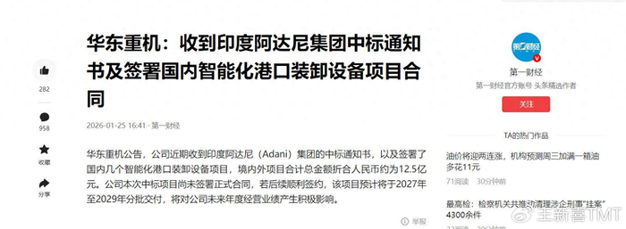 文/王新喜 没有签合同就敢在印度开工,华东重机开了先例。 刚收到印度阿达尼集团12.5亿订单的通知书,合同还没有签,工厂那边就已经开始全速运转起来,采 购、产线方面全力推进。在装备制造业中,华东重机这一系列的操作,让业内捏了一把汗,这可能是一 次高风险的赌注。 阿达尼这家公司在印度很有分量,它管理着全国将近三分之一的港口吞吐量,背后有莫迪政府的"印度 制造"作为支撑,这次购买华东重机的智能岸桥和轨道吊,是因为印度自己造不出这么精密又集成度高 的设备,但印度想在2030年把港口吞吐量翻四倍,但目前印度港口里九成的设备都太旧了,不好用,如 果不更新,运营肯定受影响。 而印度港口七成左右的设备都得从国外买。本地工厂能把机械组装起来,但不会连接系统。海关的 ICEGATE系统和码头的TOS系统像两扇打不开的门,他们连对接的接口都拿不到。可中国设备一装 好,数据自己就能连通,还能远程升级系统,这让印度解决了就算有图纸也解决不了问题。 他们想解决孟买、金奈这些港口拥堵的问题,中国设备成了性价比更高的选择。德国日本的设备做工精 致,但系统封闭,像孤岛一样打不开。中国设备硬件不一定最强,但接口开放,数据可以提取,协议能 修改 ...