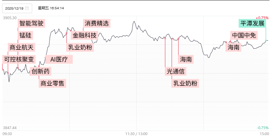 智通财经12月19日讯,今日70股涨停,23股炸板,封板率为75%,胜通能源6连板,浙江世宝4连板,苏利股份、中天服务、鹭燕医药3连板,西部材料11天6 板,威帝股份10天5板,九牧王、嘉美包装6天4板。沪指震荡回升,创业板指冲高回落,此前一度涨超1.5%。东百集团、平潭发展、海峡创新等多只高位股 尾盘跳水。沪深两市成交额1.73万亿,较上一个交易日放量704亿。盘面上,市场热点快速轮动,全市场超4400只个股上涨。板块方面,海南、乳业、零售 等板块涨幅居前,贵金属、半导体等板块跌幅居前。 | 星期五 16:54:14 | 2025/12/19 昌 | | | | | --- | --- | --- | --- | --- | | +0.75% | 3905.30 | 消费精选 | 智能驾驶 | 平潭发展 | | 锰硅 | 中国中免 | 金融科技 | W | nN | | 乳业奶粉 | 商业航天 | 海南 | | | | Al医疗 | 可控核聚变 | 海南 | | | | 光通信 | 创新药 | | | | | 乳业奶粉 | 商业零售 | | | | | 3847.44 | -0.75% | 11:30 / ...