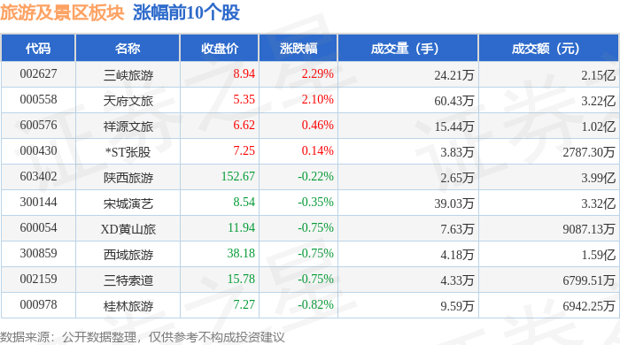 | 代码 | 名称 | 收盘价 | 涨跌幅 | 成交量(手) | 成交额(元) | | --- | --- | --- | --- | --- | --- | | 600593 | 大连圣亚 | 46.27 | -5.65% | 12.55万 | 5.87亿 | | 6602099 | 长自山 | 45.72 | -1.38% | 6.71万 | 3.07亿 | | 000558 | 天府文旅 | 5.30 | -0.93% | C 40.32万 | 2.13亿 | | 000610 | 西安旅游 | 13.17 | -0.23% | 12.03万 | 1.58亿 | | 000524 | 岭南控股 | 12.76 | -0.16% | 10.21万 | 1.30亿 | | 300144 | 宋城演艺 | 8.53 | -0.12% | 29.64万 | 2.53亿 | | 600706 | 曲江文旅 | 11.25 | -0.09% | 14.61万 | 1.63亿 | | 600054 | 黄山旅游 | 11.93 | -0.08% | 7.76万 | 9270.70万 | | 661809 | 九华旅游 ...