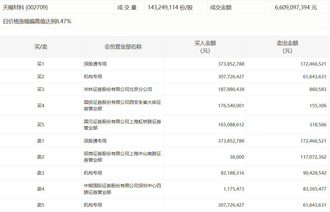 | 买 | 会员营业部名称 | 买入金额 | 卖出金额 | | --- | --- | --- | --- | | | | (元) | (元) | | 买1 | 深股通专用 | 373,852,788 | 172,466,521 | | 买2 | 机构专用 | 307,726,427 | 61,643,631 | | 三3 | 华林证券股份有限公司北京分公司 | 187,880,438 | 860,583 | | 买4 | 国投证券股份有限公司西安朱雀大街证 券营业部 | 176,540,001 | 155,306 | | ગ્રેસ | 国元证券股份有限公司上海虹桥路证券 营业部 | 165,088,612 | 318,566 | | 卖1 | 深股通专用 | 373,852,788 | 172,466,521 | | 卖2 | 招商证券股份有限公司上海中山南路证 券营业部 | 36,000 | 117,072,362 | | 卖3 | 机构专用 | 82,188,316 | 90,428,542 | | 卖4 | 中银国际证券股份有限公司深圳中心四 路证券营业部 | 1,175,473 | 83,365, ...