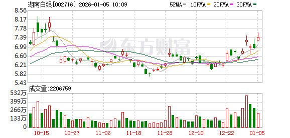 1月6日,湖南白银涨5.12%,截至发稿,报8.00元/股,成交16.65亿元,换手率9.11%,总市值225.85亿 元。 黄金股ETF(517520)基金经理为刘庭宇。 截至发稿,刘庭宇累计任职时间2年147天,现任基金资产总规模213.54亿元,任职期间最佳基金回报 105.12%, 任职期间最差基金回报-1.99%。 风险提示:市场有风险,投资需谨慎。本文为AI大模型自动发布,任何在本文出现的信息(包括但不 限于个股、评论、预测、图表、指标、理论、任何形式的表述等)均只作为参考,不构成个人投资建 议。 责任编辑:小浪快报 资料显示,湖南白银股份有限公司位于湖南省郴州市苏仙区白露塘镇福城大道1号,成立日期2004年11 月8日,上市日期2014年1月28日,公司主营业务涉及以银、铅、锌等有色金属矿采选、冶炼和深加工为 主,已形成"有色金属矿产资源探采选—多金属冶炼综合回收—精深加工"的一体化生产体系和全产业链 布局,并综合回收金、铋、锑、锌、铜、铟、钯等有价金属。主营业务收入构成为:有色金属及其制品 99.87%,其他(补充)0.13%。 从湖南白银十大流通股东角度 数据显示,永赢基金旗下1只基金位居湖 ...