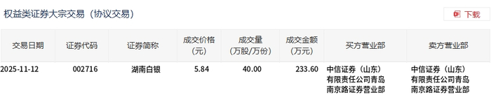 Core Insights - On November 12, Hunan Silver conducted a block trade of 400,000 shares, with a transaction value of 2.336 million yuan, accounting for 0.34% of the total transaction volume for the day [1][2] - The transaction price was 5.84 yuan, representing a discount of 9.32% compared to the market closing price of 6.44 yuan [1] Summary by Category Transaction Details - Transaction Date: November 12, 2025 [2] - Security Code: 002716 [2] - Security Name: Hunan Silver [2] - Transaction Price: 5.84 yuan [2] - Transaction Volume: 400,000 shares [2] - Transaction Amount: 2.336 million yuan [2] - Buyer Brokerage: CITIC Securities (Shandong) [2] - Seller Brokerage: CITIC Securities (Shandong) [2]