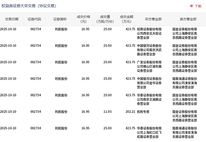 Core Insights - On October 10, 2025, Limin Co., Ltd. executed a block trade of 1.6193 million shares, amounting to 27.4471 million yuan, which represented 2.4% of the total trading volume for that day. The transaction price was 16.95 yuan, reflecting a discount of 12.18% compared to the market closing price of 19.3 yuan [1]. Trading Details - The block trade involved multiple transactions at a price of 16.95 yuan per share, with a total volume of 1.6193 million shares [1]. - The total transaction value was 27.4471 million yuan, indicating significant trading activity [1]. - The discount of 12.18% from the market closing price suggests potential investor interest at a lower entry point [1].