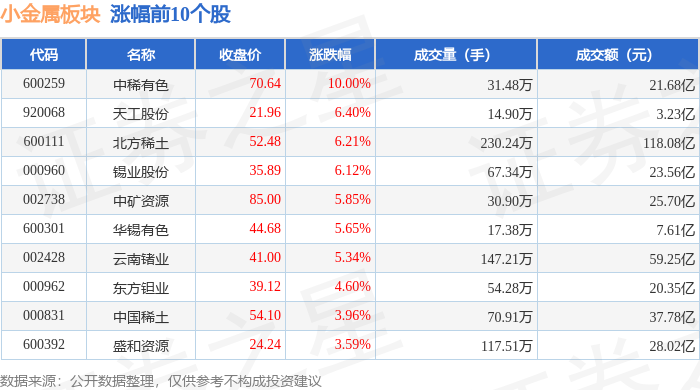 | 代码 | 名称 | 收盘价 | 涨跌幅 | 成交量(手) | 成交额(元) | | --- | --- | --- | --- | --- | --- | | 002842 | 翔鹭钨业 | 16.22 | -1.99% | 54.96万 | 8.89 Z | | 002378 | 草源钨业 | 16.65 | -1.83% | 110.37万 | 18.25 Z | | 000657 | 中钨高新 | 32.47 | -1.28% | 84.12万 | 27.22亿 | | 301026 | 浩通科技 | 32.68 | -1.27% | 10.35万 | 3.38亿 | | 600459 | 盖研铂业 | 21.32 | -1.16% | 66.24万 | 14.09亿 | | 601958 | 金铝股份 | 18.20 | -0.98% | 75.76万 | 13.77亿 | | 600281 | 华阳新材 | 6.18 | -0.16% | 19.90万 | 1.22亿 | | 002167 | 东方错业 | 13.48 | 0.00% | 46.30万 | 6.20亿 | | 001280 | ...