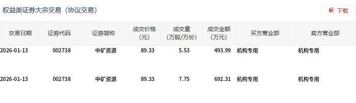 中矿资源1月13日现2笔大宗交易 总成交金额1186.3万元 其中机构买入1186.3万元 溢价率为0.00%