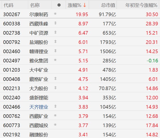 股票频道更多独家策划、专家专栏,免费查阅>> 责任编辑:栎树 1月13日,A股市场锂矿股走强,其中,西藏珠峰涨超8%,中矿资源、盐湖股份涨超6%,赣锋锂业、雅 化集团涨超5%。 消息面上,广期所碳酸锂期货主力合约触及涨停,涨幅11.99%,报174060元/吨,连续两个交易涨停, 本月迄今累计涨超40%。 | 代码 | 名称 | | 涨幅% ↓ | 总市值 | 年初至今涨幅% | | --- | --- | --- | --- | --- | --- | | 300267 | 尔康制药 | 策 | 19.95 | 91.79亿 | 30.50 | | 600338 | 西藏珠峰 | 1 | 8.97 | 177亿 | 28.39 | | 002738 | 中矿资源 | 1 | 6.47 | 653 Z | 15.21 | | 000792 | 盐湖股份 | 1 | 6.01 | 1793亿 | 20.31 | | 002460 | 赣锋锂业 | 1 | 5.71 | 1506亿 | 14.25 | | 002497 | 雅化集团 | 长 | 5.15 | 285亿 | -0.16 | | 001203 | 大 ...