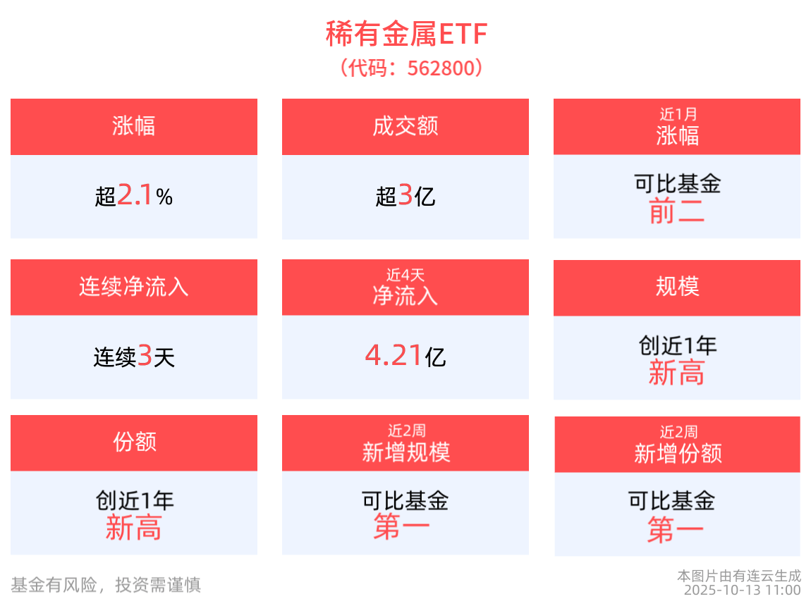 截至2025年10月13日 11:00,中证稀有金属主题指数强势上涨2.11%,成分股银河磁体20cm涨停,三川智慧上涨11.70%,有研新材上涨9.91%,金力永磁,北 方稀土等个股跟涨。稀有金属ETF(562800)上涨2.14%。拉长时间看,截至2025年10月10日,稀有金属ETF近2周累计上涨12.00%。 流动性方面,稀有金属ETF盘中换手11.57%,成交3.59亿元,市场交投活跃。 规模方面,稀有金属ETF最新规模达30.80亿元,创成立以来新高,位居可比基金第一。份额方面,稀有金属ETF最新份额达36.70亿份,创成立以来新高, 位居可比基金第一。从资金净流入方面来看,稀有金属ETF近3天获得连续资金净流入,最高单日获得3.58亿元净流入,合计"吸金"5.51亿元。 截至10月10日,稀有金属ETF近3年净值上涨17.31%。从收益能力看,截至2025年10月10日,稀有金属ETF自成立以来,最高单月回报为24.02%,最长连涨 月数为5个月,最长连涨涨幅为66.25%,上涨月份平均收益率为8.60%。 以上内容与数据,与有连云立场无关,不构成投资建议。据此操作,风险自担。 中信建投研报表示 ...