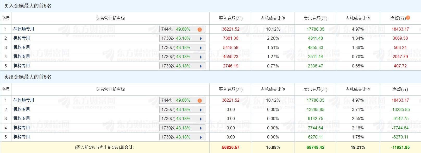| | 买入金额最大的前5名 | | | | | --- | --- | --- | --- | --- | | 序号 | | 交易营业部名称 | 买入金额(万) | 占总成交比例 | | 1 | 深股通专用 | 744次 49.60% 2 | 36221.52 | 10.12% | | 2 | eastmoney.com 机构专用 | 1730次 43.18% | 7881.06 | 2.20% | | 3 | 机构专用 | 1730次 43.18% | 5418.58 | 1.51% | | 4 | 机构专用 | 1730次 43.18% | 4559.23 | 1.27% | | 5 | 机构专用 | 1730次 43.18% | 2746.19 | 0.77% | | 序号 | | 交易营业部名称 | | | 买入金额(万) | 占总成交比例 | | --- | --- | --- | --- | --- | --- | --- | | | 深股通专用 | | 744次 49.60% | (7) | 36221.52 | 10.12% | | 2 | 机构专用 | BBSI money.com | 1 ...