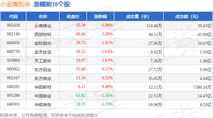 证券之星消息,1月8日小金属板块较上一交易日下跌2.43%,中矿资源领跌。当日上证指数报收于 4082.98,下跌0.07%。深证成指报收于13959.48,下跌0.51%。小金属板块个股涨跌见下表: | 代码 | 名称 | 主力净流入(元) | 主力净占比 游资净流入 (元) | | 游资净占比 散户净流入(元) | | 散户净占比 | | --- | --- | --- | --- | --- | --- | --- | --- | | 002428 | 云南错业 | 1.94亿 | 4.93% | -1.69 Z | -4.28% | -2559.48万 | -0.65% | | 002149 | 西部材料 | 1.50亿 | 3.43% | -2197.25万 | -0.50% | -1.29 Z | -2.93% | | 920068 | 天工股份 | 537.60万 | 3.67% | -243.22万 | -1.66% | -2.54万 | -0.02% | | 002842 翔鹭钨业 | | 449.15万 | 0.51% | 1129.23万 | 1.28% | -1578.38万 | -1 ...