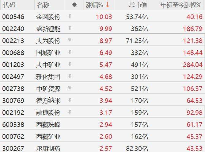 Group 1 - Lithium stocks in the A-share market continue to rise, with notable gains in companies such as Jinyuan Co. (000546) and Shengxin Lithium Energy, which both hit the daily limit, while Daway Co. increased by nearly 9% [1] - The main contract for lithium carbonate futures rose over 4%, currently priced at 96,560 yuan per ton [1] Group 2 - Jinyuan Co. (000546) saw a price increase of 10.03%, with a total market capitalization of 5.374 billion yuan and a year-to-date increase of 40.16% [2] - Shengxin Lithium Energy (002240) experienced a 9.99% rise, with a market cap of 36.2 billion yuan and a year-to-date increase of 186.79% [2] - Daway Co. (002213) increased by 8.97%, with a market cap of 7.123 billion yuan and a year-to-date increase of 121.38% [2] - Guocheng Mining (000688) rose by 6.49%, with a market cap of 33.2 billion yuan and a year-to-date increase of 148.44% [2] - Dazhong Mining (001203) increased by 5.47%, with a market cap of 49.1 billion yuan and a year-to-date increase of 284.04% [2] - Yahua Group (002497) saw a 4.68% increase, with a market cap of 30.1 billion yuan and a year-to-date increase of 124.29% [2] - Zhongkuang Resources (002738) rose by 4.52%, with a market cap of 52.1 billion yuan and a year-to-date increase of 106.37% [2]