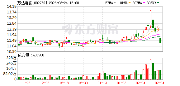 2月26日,万达电影盘中下跌2.07%,截至10:44,报10.90元/股,成交5.62亿元,换手率2.44%,总市值 230.18亿元。 资金流向方面,主力资金净流出1.09亿元,特大单买入3368.78万元,占比6.00%,卖出8716.93万元,占 比15.52%;大单买入1.17亿元,占比20.77%,卖出1.72亿元,占比30.68%。 万达电影今年以来股价跌3.71%,近5个交易日跌12.66%,近20日跌3.63%,近60日跌4.55%。 截至1月30日,万达电影股东户数11.25万,较上期增加5.94%;人均流通股18668股,较上期减少 4.95%。2025年1月-9月,万达电影实现营业收入97.87亿元,同比减少0.61%;归母净利润7.08亿元,同 比增长319.92%。 分红方面,万达电影A股上市后累计派现11.53亿元。近三年,累计派现0.00元。 机构持仓方面,截止2025年9月30日,万达电影十大流通股东中,香港中央结算有限公司位居第四大流 通股东,持股5549.28万股,相比上期增加454.75万股。南方中证500ETF(510500)位居第七大流通股 东,持股1841.08万 ...