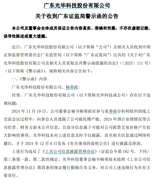 Core Points - The China Securities Regulatory Commission (CSRC) issued a warning letter to Guanghua Technology on October 21 for disclosing non-public information during an online meeting with analysts [1] - The company's secretary revealed details about lithium sulfide production capacity and expected performance for 2024, which could significantly impact stock trading prices [1] - Guanghua Technology failed to disclose this information in a timely manner, only releasing a clarification announcement on December 6 after the information was circulated online [1] - As of October 21, Guanghua Technology's stock closed at 21.29 yuan, reflecting a year-to-date increase of 28.8% [1]