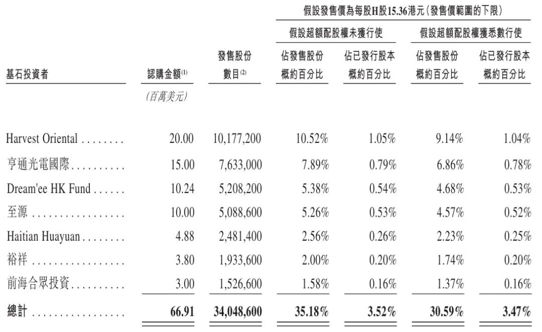 公司已订立基石投资协议,据此,基石投资者已同意在若干条件的限制下,按发售价认购或促使其指定 实体认购一定数量的发售股份,该等发售股份可按总金额约6691万美元(或约5.23亿港元)认购。基于发 售价每股发售股份17.00港元(即本招股章程所载指示性发售价范围的上限),基石投资者将认购的发售股 份总数将为3076.36万股。基石投资者包括Harvest Oriental、亨通光电国际(由亨通光电(600487.SH)全资 拥有)、Dream'ee HK Fund、至源控股(00990.HK)、Haitian Huayuan、裕祥(由网誉科技(01483.HK)全资拥 有)、前海合众投资。 公司估计,假设超额配股权未获行使,且发售价为每股H股16.18港元(即本招股章程所述的指示性价格 范围的中位数),公司将收到约14.86亿港元的全球发售所得款项净额。根据公司的战略,公司目前计划 将这些所得款项净额用于以下用途,但可根据业务需要的变化和市场环境的变动进行调整:(i)约25.0% 将用于扩充公司的全球生产能力;(ii)约25.0%将用于在全球工业机器人产业链上下游有选择地寻求战略 联盟、投资及收购机会;(iii) ...