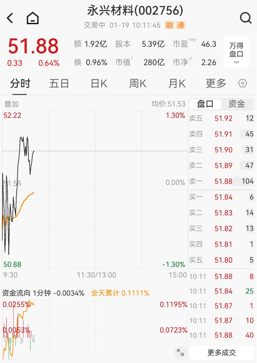资料显示,永兴特种材料科技股份有限公司位于浙江省湖州市霅水桥路618号,成立日期2000年7月19 日,上市日期2015年5月15日,公司主营业务涉及不锈钢及特殊合金材料等特种金属材料棒线材的研 发、生产和销售。主营业务收入构成为:棒材47.71%,线材24.66%,碳酸锂20.10%,其他7.53%。 永兴材料所属申万行业为:有色金属-能源金属-锂。所属概念板块包括:特种钢、养老金概念、MSCI 中国、锂电池、高温合金等。 1月16日,永兴材料盘中下跌2.00%,截至10:10,报52.43元/股,成交2.13亿元,换手率1.03%,总市值 282.65亿元。 资金流向方面,主力资金净流出1980.95万元,特大单买入417.90万元,占比1.96%,卖出1114.21万元, 占比5.23%;大单买入3496.29万元,占比16.42%,卖出4780.93万元,占比22.45%。 永兴材料今年以来股价跌3.35%,近5个交易日跌2.60%,近20日涨8.84%,近60日涨38.81%。 分红方面,永兴材料A股上市后累计派现56.62亿元。近三年,累计派现43.62亿元。 机构持仓方面,截止2025年9月30 ...