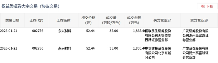 1月21日,永兴材料大宗交易成交70万股,成交额3670.8万元,占当日总成交额的2.54%,成交价52.44 元,较市场收盘价53.78元折价2.49%。 | 交易日期 | 证券代码 | 证券简称 | 成交价格 | 成交量 | 成交金额 买方营业部 | 卖方营业部 | | --- | --- | --- | --- | --- | --- | --- | | | | | (元) | (万股/万份) | (万元) | | | 2026-01-21 | 002756 | 永兴材料 | 52.44 | 35.00 | 1,835.4国联民生证券股份 | 广发证券股份有限 | | | | | | | 有限公司无锡盛岸 | 公司湖州高富路证 | | | | | | | 西路证券营业部 | 劳营业部 | | 2026-01-21 | 002756 | 永兴材料 | 52.44 | 35.00 | 1,835.40中信建投证券股份 | 广发证券股份有限 | | | | | | | 有限公司北京东城 | 公司湖州高富路证 | | | | | | | 分公司 | 勞营业部 | ...