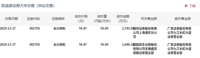 | 交易日期 | 证券代码 | 证券简称 | 成交价格 | 成交量 | 成交金额 买方营业部 | 卖方营业部 | | --- | --- | --- | --- | --- | --- | --- | | | | | (元) | (万股/万份) | (万元) | | | 2025-11-17 | 002756 | 永兴材料 | 54.87 | 50.00 | 2,743.5(国信证券股份有限 | 广发证券股份有限 | | | | | | | 公司上海浦东分公 | 公司九江长虹大道 | | | | | | | D | 证券量业部 | | 2025-11-17 | 002756 | 永兴材料 | 54.87 | 30.00 | 1,646.1 国联民生证券股份 | 广发证券股份有限 | | | | | | | 有限公司院制盛岸 | 公司九江长虹大道 | | | | | | | 西路证券营业部 | 证券营业部 | 11月17日,永兴材料大宗交易成交80万股,成交额4389.6万元,占当日总成交额的1.91%,成交价54.87 元,较市场收盘价56.28元折价2.51%。 ...