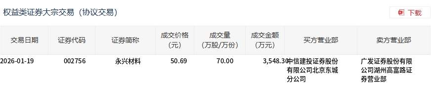 | 交易日期 | 证券代码 | 证券简称 | 成交价格 (元) | 成交量 | 成交金额 买方营业部 (万元) | 卖方营业部 | | --- | --- | --- | --- | --- | --- | --- | | | | | | (万股/万份) | | | | 2026-01-19 | 002756 | 永兴材料 | 50.69 | 70.00 | 3,548.30信建投证券股份 | 广发证券股份有限 | | | | | | | 有限公司北京东城 | 公司湖州高富路证 | | | | | | | 分公司 | 券营业部 | 1月19日,永兴材料大宗交易成交70万股,成交额3548.3万元,占当日总成交额的4.45%,成交价50.69元,较市场收盘价 51.99元折价2.5%。 ...