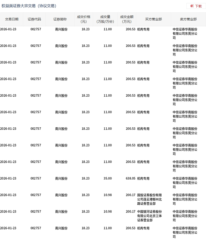 1月23日,南兴股份大宗交易成交166.96万股,成交额3043.69万元,占当日总成交额的4.4%,成交价 18.23元,较市场收盘价20.98元折价13.11%。 | 交易日期 | 证券代码 | 证券简称 | 成交价格 | 成交量 | 成交金额 买方营业部 | 卖方营业部 | | --- | --- | --- | --- | --- | --- | --- | | | | | (元) | (万股/万份) | (万元) | | | 2026-01-23 | 002757 | 南兴股份 | 18.23 | 11.00 | 200.53 机构专用 | 中信证券华南股份 | | | | | | | | 有限公司东莞分公 | | | | | | | | n | | 2026-01-23 | 002757 | 南兴股份 | 18.23 | 11.00 | 200.53 机构专用 | 中信证券华南股份 | | | | | | | | 有限公司东莞分公 | | | | | | | | n | | 2026-01-23 | 002757 | 南兴股份 | 18.23 | 11.00 | 200.53 机构专用 | 中信证 ...