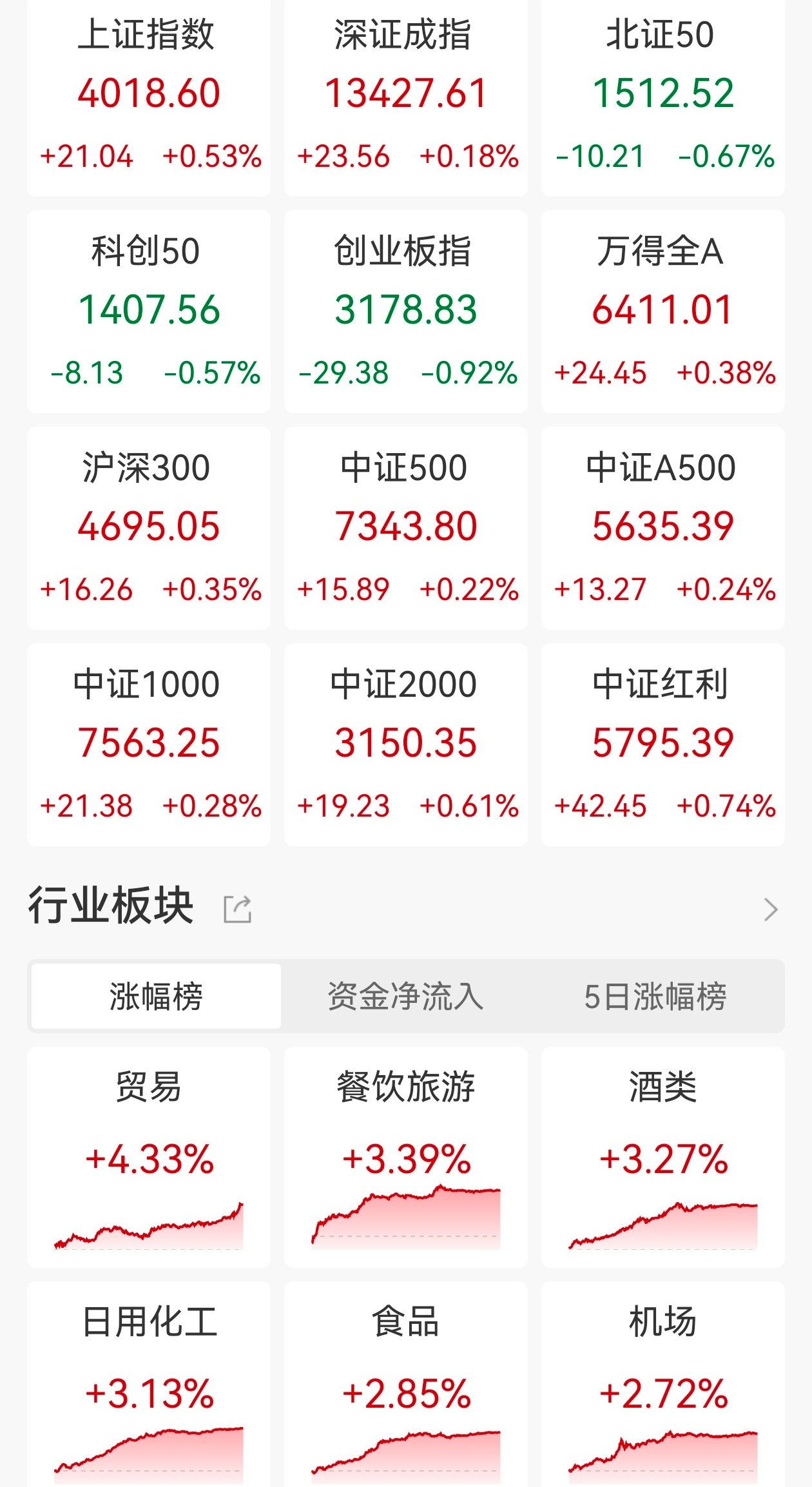 | 涨幅榜 | 资金净流入 | 5日涨幅札 | | --- | --- | --- | | 贸易 | 餐饮旅游 | 酒类 | | +4.33% | +3.39% | +3.279 | | 日用化工 | 食品 | 机场 | | +3.13% | +2.85% | +2.729 | A股三大指数今日涨跌不一,截至收盘,沪指涨0.53%报4018点,深证成指涨0.18%,创业板指跌0.92%。全市场成交额2.19万亿元,较前一交易日增量1742 亿元,近3400股上涨。 盘面上,财政部称将继续实施好提振消费专项行动,大消费板块集体走高,乳业、免税概念、白酒、食品饮料等方向领涨,中国中免、庄园牧场、酒鬼酒及 惠发食品等多股涨停;氟化工板块反复活跃,天际股份涨停;培育钻石板块走高,沃尔德一度涨超13%;纽约期金向上触及4060美元,贵金属概念拉升,湖 南黄金领涨;有机硅、商业百货、航空几次及小红书概念等涨幅居前。另外,船舶制造板块下挫,国瑞科技跌近9%;机器人板块走低,拓普集团等多股跌 逾6%;小金属板块走弱,东方钽业跌停;电源设备、超导概念、CPO概念及铜缆高速连接等板块跌幅居前。(格隆汇) | 上证指数 | 深证成 ...