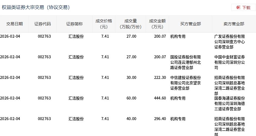 | 交易日期 | 证券代码 | 证券简称 | 成交价格 | 成交量 | 成交全额 买方营业部 | | 卖方营业部 | | --- | --- | --- | --- | --- | --- | --- | --- | | | | | (元) | (万股/万份) | (万元) | | | | 2026-02-04 | 002763 | 汇洁股份 | 7.41 | 27.00 | 200.07 机构专用 | | 广发证券股份有限 | | | | | | | | | 公司深圳壹方中心 | | | | | | | | | 证券营业部 | | 2026-02-04 | 002763 | 汇洁股份 | 7.41 | 27.00 | 200.07 国投证券股份有限 | | 中国中金财富证券 | | | | | | | 公司连云港郁州北 | | 有限公司深圳分公 | | | | | | | 路证券营业部 | 司 | | | 2026-02-04 | 002763 | 汇洁股份 | 7.41 | 30.00 | 222.30 中信建投证券股份 | | 招商证券股份有限 | | | | | | | 有限公司北京望京 | | 公司 ...