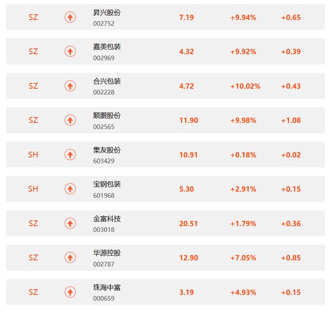 包装板块走高,昇兴股份、嘉美包装午后直线拉升涨停,合兴包装、顺灏股份此前封板,宏裕包材涨超 10%,集友股份、宝钢包装、金富科技、华源控股、珠海中富等跟涨。 | SZ | 君兴股份 | 7.19 | +9.94% | +0.65 | | --- | --- | --- | --- | --- | | | 002752 | | | | | SZ | 嘉美包装 | 4.32 | +9.92% | +0.39 | | | 002969 | | | | | SZ | 合兴包装 | 4.72 | +10.02% | +0.43 | | | 002228 | | | | | SZ | 顺灏股份 | 11.90 | +9.98% | +1.08 | | | 002565 | | | | | SH | 集友股份 | 10.91 | +0.18% | +0.02 | | | 603429 | | | | | SH | 宝钢包装 | 5.30 | +2.91% | +0.15 | | | 601968 | | | | | SZ | 金富科技 | 20.51 | +1.79% | +0.36 | | | 003018 | | | ...