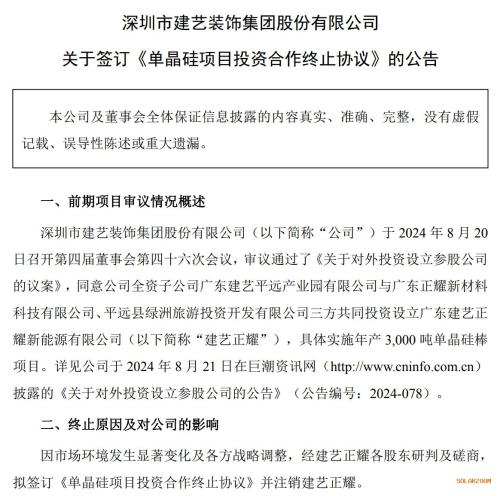 *ST建艺:拟签订《单晶硅项目投资合作终止协议》并注销建艺正耀