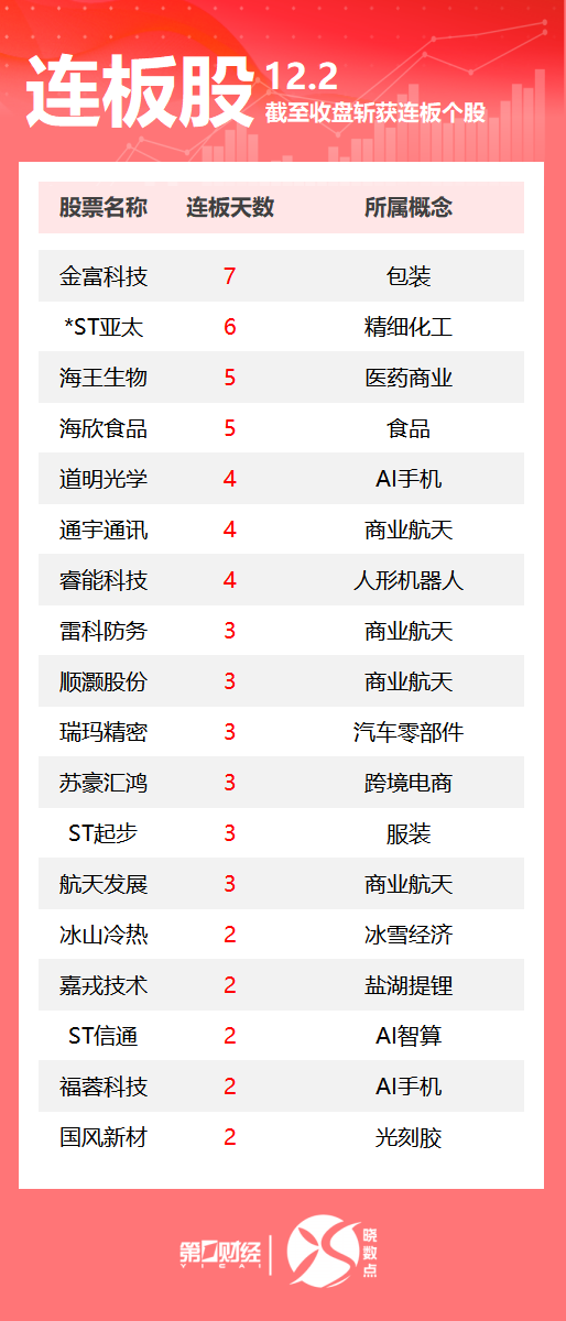 12月2日,Wind数据显示,A股市场共计55只个股涨停。其中医药商业板块海王生物收获5连板;商业航 天概念多股连板,通宇通讯4连板,雷科防务、顺灏股份、航天发展均3连板。一图速览今日连板股>> 医药商业板块海王生物收获5连板,商业航天概念通宇通讯4连板。 | 连板股 12.2 | | 截至收盘斩获连板个股 | | --- | --- | --- | | 股票名称 | 连板天数 | 所属概念 | | 金富科技 | 7 | 包装 | | *ST亚太 | 6 | 精细化工 | | 海王生物 | 5 | 医药商业 | | 海欣食品 | 5 | 食品 | | 道明光学 | 4 | Al手机 | | 通宇通讯 | ব | 商业航天 | | 睿能科技 | 4 | 人形机器人 | | 雷科防务 | 3 | 商业航天 | | 顺灏股份 | 3 | 商业航天 | | 瑞玛精密 | 3 | 汽车零部件 | | 苏豪汇鸿 | 3 | 跨境电商 | | ST超步 | 3 | 服装 | | 航天发展 | 3 | 商业航天 | | 冰山冷热 | 2 | 冰雪经济 | | 嘉戎技术 | 2 | 盐湖提锂 | | ST信通 | 2 | Al ...