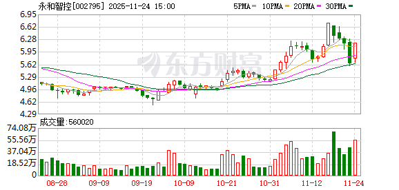 11月25日,永和智控盘中上涨2.10%,截至10:44,报6.32元/股,成交1.40亿元,换手率5.19%,总市值 28.17亿元。 截至9月30日,永和智控股东户数3.13万,较上期增加54.10%;人均流通股13876股,较上期减少 35.11%。2025年1月-9月,永和智控实现营业收入5.82亿元,同比减少7.25%;归母净利润-6046.25万 元,同比增长20.65%。 分红方面,永和智控A股上市后累计派现2.00亿元。近三年,累计派现0.00元。 资金流向方面,主力资金净流出60.33万元,特大单买入849.07万元,占比6.06%,卖出1052.84万元,占 比7.52%;大单买入2730.03万元,占比19.50%,卖出2586.60万元,占比18.47%。 责任编辑:小浪快报 资料显示,永和流体智控股份有限公司位于浙江省台州市玉环市清港镇工业产业集聚区,成立日期2003 年8月28日,上市日期2016年4月28日,公司主营业务涉及医疗健康产业、流体智控业务。主营业务收入 构成为:阀门管件类89.41%,医疗服务及其他产业10.57%,光伏电池片0.02%。 永和智控所属申万行业为:机械 ...