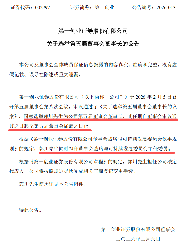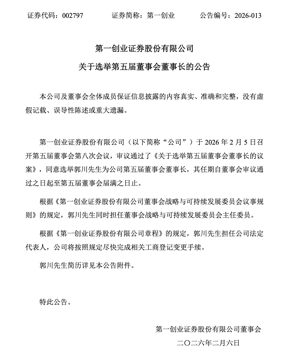 (编辑 任世碧) 证券日报网讯 2月5日,第一创业发布公告称,公司于2026年2月5日召开第五届董事会第八次会议,审 议通过了《关于选举第五届董事会董事长的议案》,同意选举郭川先生为公司第五届董事会董事长,其 任期自董事会审议通过之日起至第五届董事会届满之日止。 ...