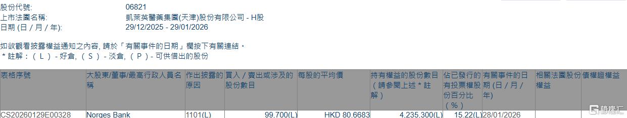 格隆汇1月29日丨根据联交所最新权益披露资料显示,2026年1月28日,凯莱英(06821.HK)获Norges Bank在场内以每股均价80.6683港元增持9.97万股,涉资 约804.26万港元。 增持后,Norges Bank最新持股数目为423.53万股,持股比例由14.86%上升至15.22%。 | 股份代號: | 06821 | | --- | --- | | 上市法國名稱: | 凱萊英醫藥集團(天津)股份有限公司 - H股 | | 日期 (日 / 月 / 年): | 29/12/2025 - 29/01/2026 | | 表格序號 | 大股東/董事/最高行政人員名 作出披露的 買入 / 賣出或涉及的 每股的平均價 | | | | 持有權益的股份數目 佔已發行的 有關事件的日 相關法 | | | --- | --- | --- | --- | --- | --- | --- | | | it | 原因 | 股份數目 | | (請參閱上述 * 註 有投票權股 期 (日 / 月 / 權益 | | | | | | | | 服务) | 份自分比 KE | | and the first to the s ...