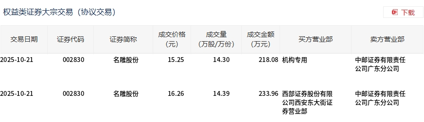 名雕股份10月21日现2笔大宗交易 总成交金额452.04万元 其中机构买入218.08万元 溢价率为-11.90%