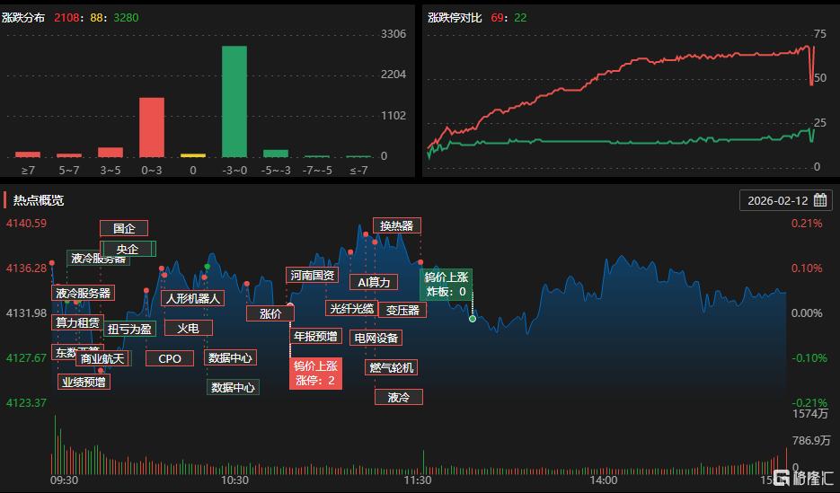 2026.02. 12 本文字数:1155,阅读时长大约2分钟 作者 | 一财阿驴 10:38 沪深两市成交额突破1万亿元。 10:23 电力板块震荡拉升,晋控电力涨停,豫能控股2连板,闽东电力、赣能股份、涪陵电力走高。 11:32 A股午盘丨创业板指半日涨超1%,电网设备板块走高 沪指涨0.12%,深成指涨0.8%,创业板指涨1.18%,科创综指涨0.93%。小金属、电网设备、特高 压板块走强,半导体板块表现活跃,影视院线、短剧游戏板块跌幅居前。截至午盘,全市场超2700 只个股上涨。 | 代码 | 名称 | 现价 | 涨跌 | 涨跌幅 | | --- | --- | --- | --- | --- | | 000001 上证指数 | | 4137.06 | 5.07 | 0.12% | | 399001 | 深证成指 | 14274.93 113.99 | | 0.80% | | 881001 万得全A | | 6839.37 | 36.95 | 0.54% | | 000680 | 科创综指 | 1804.89 | 16.67 | 0.93% | | 399006 | 创业板指 | 3323.56 | ...