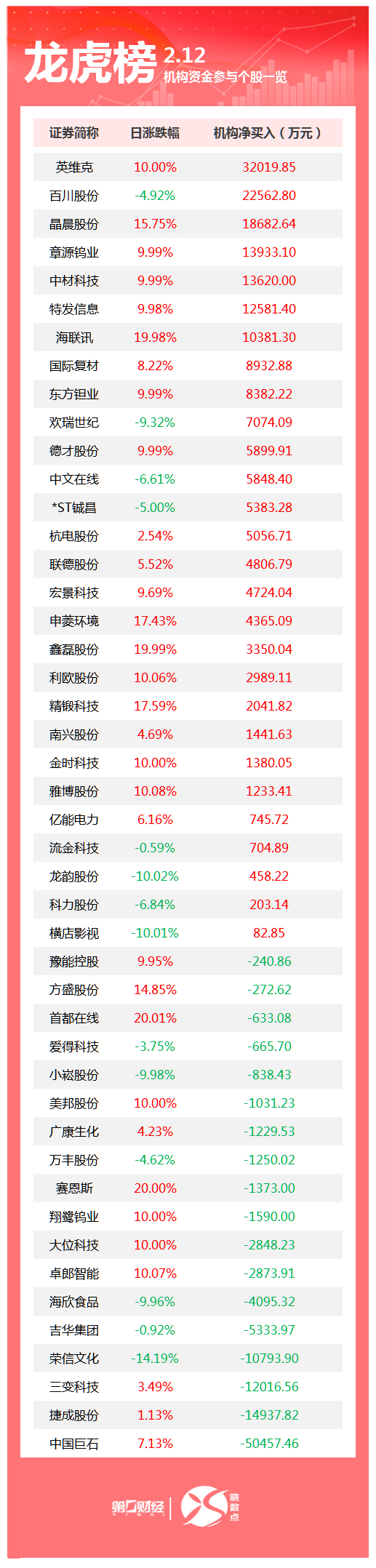 | 17 Prive All | 机构资金参与个股一 | | | --- | --- | --- | | 证券简称 | 日涨跌幅 | 机构净买入(万元) | | 英维克 | 10.00% | 32019.85 | | 直川股份 | -4.92% | 22562.80 | | 晶晨股份 | 15.75% | 18682.64 | | 章源钨业 | 9.99% | 13933.10 | | 中材科技 | 9.99% | 13620.00 | | 特发信息 | 9.98% | 12581.40 | | 海联讯 | 19.98% | 10381.30 | | 国际复材 | 8.22% | 8932.88 | | 东方锂业 | 9.99% | 8382.22 | | 欢瑞世纪 | -9.32% | 7074.09 | | 德才股份 | 9.99% | 5899.91 | | 中文在线 | -6.61% | 5848.40 | | *ST城昌 | -5.00% | 5383.28 | | 杭电股份 | 2.54% | 5056.71 | | 联德股份 | 5.52% | 4806.79 | | 宏景科技 | 9.69% ...