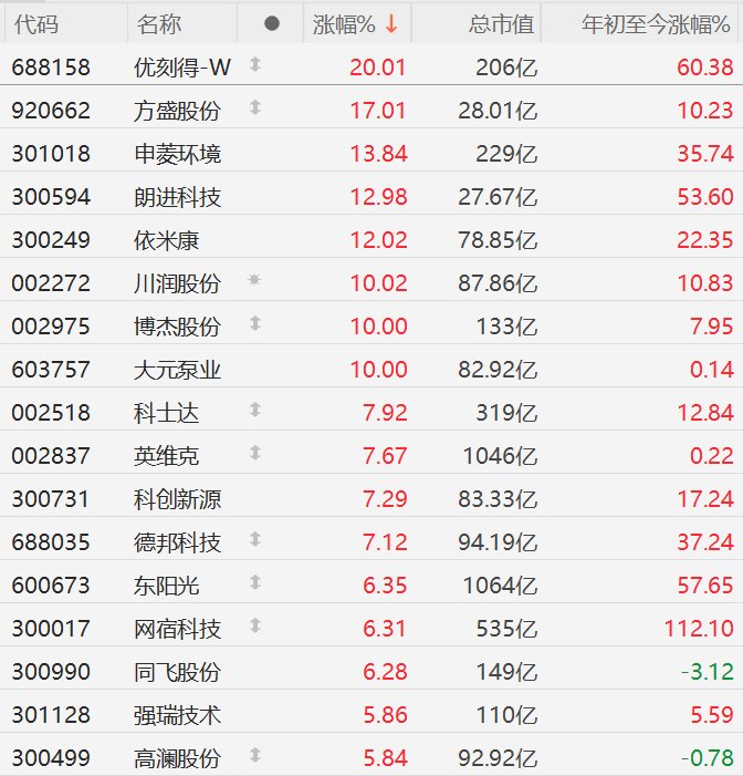 Group 1 - The A-share market saw a collective surge in liquid cooling concept stocks, with Fangsheng Co. rising by 17%, Shenling Environment increasing by over 13%, and Langjin Technology and Yimikang both up by over 12% [1] - Other notable performers included Chuanrun Co., Bojie Co., and Dayuan Pump Industry, which all hit the daily limit of 10%, while Keda, Yingweik, Kexin Innovation, and Debang Technology rose by over 7% [1] Group 2 - The table lists several stocks with their respective price changes and market capitalizations, highlighting that Youkede-W had a price increase of 20.01% with a total market value of 20.6 billion, and a year-to-date increase of 60.38% [2] - Wansheng Co. experienced a 17.01% rise, with a market cap of 2.801 billion and a year-to-date increase of 10.23% [2] - Shenmeng Environment saw a 13.84% increase, with a market cap of 22.9 billion and a year-to-date increase of 35.74% [2]