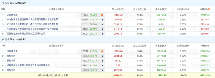 | 英入金额最大的前5名 | | | | | | | | | | --- | --- | --- | --- | --- | --- | --- | --- | --- | | ਖ਼ੇਦੇ | 交易营业部名称 | | | 买入金额(万) | 品质成交比例 | 类出金额(万) | 占总成交比例 | 净额(万)0 | | 深胶通专用 | | 785次 45.35% | 0 | 12186 78 | 2.64% | 39676.54 | 8.59% | -27489.76 | | 2 | 东方财富证券股份有限公司拉萨团结路第一证券营业部 | 642次 27.57% | b | 3867.09 | 0.84% | 1145.51 | 0.25% | 2721.58 | | 3 | 光大证券股份有限公司上海虹口区东大名路证券踏业部 | 2次 50.00% | > | 3253.16 | 0.70% | 0.00 | 0.00% | 3253.16 | | 4 | 东方财富证券股份有限公司拉萨东环路第一证券营业部 | 415次 28.19% | | 3116.14 | 0.67% | 1503 54 | 0.33% | ...
