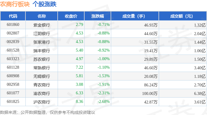 证券之星消息,2月2日农商行板块较上一交易日下跌1.94%,沪农商行领跌。当日上证指数报收于 4015.75,下跌2.48%。深证成指报收于13824.35,下跌2.69%。农商行板块个股涨跌见下表: | 代码 | 名称 | 收盘价 | 涨跌幅 | 成交量(手) | 成交额(元) | | | --- | --- | --- | --- | --- | --- | --- | | 601860 | 紫金银行 | 2.79 | -0.71% | 46.93万 | | 1.32 Z | | 002807 | 江阴银行 | 4.53 | -0.88% | 44.60万 | | 2.04亿 | | 002839 | 张家港行 | 4.53 | -0.88% | 31.55万 | | 1.44亿 | | 601528 | 瑞丰银行 | 5.40 | -0.92% | 19.41万 | | 1.06亿 | | 603323 | 苏农银行 | 4.97 | -1.00% | 29.89万 | | 1.50亿 | | 601128 | 常熟银行 | 7.22 | -1.10% | 46.60万 | | 3.40亿 | | 60 ...