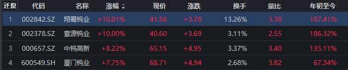 钨指数爆发再度爆发,章源钨业7天5板,翔鹭钨业涨停,中钨高新、厦门钨业跟涨。 | 还原 | લ્દ્રીને 涨幅 : | 名称 | 现价 | 涨跌 | 换手 | 量出 | 年初至今 | | --- | --- | --- | --- | --- | --- | --- | --- | | 1 | 002842.SZ 翔蟹钨业 +10.01% | | 41.56 | +3.78 | 13.26% | 3.30 | 187.41% | | 2 | 002378.SZ 章源钨业 +10.00% | | 40.60 | +3.69 | 3.11% | 2.55 | 186.32% | | ო | 000657.SZ 中钨高新 +8.22% | | 65.15 | +4.95 | 3.37% | 3.40 | 135.11% | | ব | 600549.SH 厦门钨业 +7.75% | | 68.71 | +4.94 | 2.68% | 3.82 | 67.34% | 章源钨业上调2026年2月下半月长单采购报价。消息面上,章源钨业公布2026年2月下半月长单采购报价:55%黑钨精矿:73.00万元/标吨;55% ...