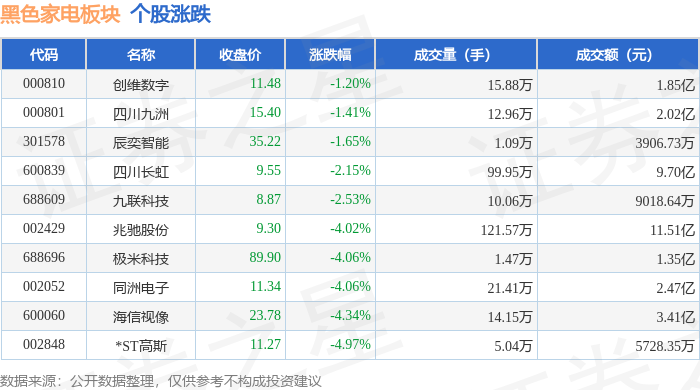 证券之星消息,2月3日黑色家电板块较上一交易日上涨2.14%,兆驰股份领涨。当日上证指数报收于 4067.74,上涨1.29%。深证成指报收于14127.1,上涨2.19%。黑色家电板块个股涨跌见下表: | 代码 | 名称 | 收盘价 | 涨跌幅 | 成交量(手) | 成交额(元) | | --- | --- | --- | --- | --- | --- | | 002429 | 北驰股份 | 9.70 | 4.30% | 105.21万 | 10.20亿 | | 600839 | 四川长虹 | 9.81 | 2.72% | 101.89万 | 9.91亿 | | 301578 | 辰奕智能 | 36.09 | 2.47% | 1.04万 | 3748.90万 | | 000801 | 四川九洲 | 15.77 | 2.40% | 15.09万 | 2.37亿 | | 688609 | 九联科技 | 9.04 | 1.92% | 7.20万 | 6450.92万 | | 000810 | 创维数字 | 11.68 | 1.74% | 12.94万 | 1.51亿 | | 688696 | 极米科技 | 91 ...