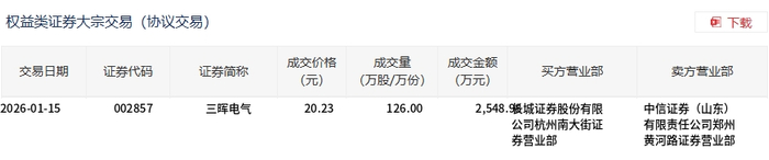1月15日,三晖电气大宗交易成交126万股,成交额2548.98万元,占当日总成交额的9.56%,成交价 20.23元,较市场收盘价23.52元折价13.99%。 | 交易日期 | 证券代码 | 证券简称 | 成交价格 | 成交量 | 成交金额 买方营业部 | | 卖方营业部 | | --- | --- | --- | --- | --- | --- | --- | --- | | | | | (元) | (万股/万份) | (万元) | | | | 2026-01-15 | 002857 | 三晖电气 | 20.23 | 126.00 | 2,548.毁城证券股份有限 | | 中信证券(山东) | | | | | | | | 公司杭州南大街证 | 有限责任公司郑州 | | | | | | | | 劳营业部 | 黄河路证券营业部 | ...