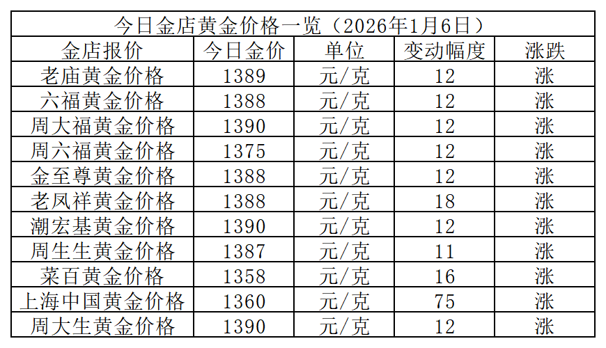 金价全线飘红!2026年1月6日国内品牌金店行情速递