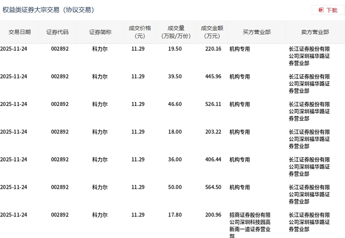 | 交易日期 | 证券代码 | 证券简称 | 成交价格 | 成交量 | 成交金额 | 买方营业部 | 卖方营业部 | | --- | --- | --- | --- | --- | --- | --- | --- | | | | | (元) | (万股/万份) | (万元) | | | | 2025-11-24 | 002892 | 科力尔 | 11.29 | 19.50 | 220.16 | 机构专用 | 长江证券股份有限 | | | | | | | | | 公司深圳福华路证 | | | | | | | | | 券营业部 | | 2025-11-24 | 002892 | 科力尔 | 11.29 | 39.50 | 445.96 | 机构专用 | 长江证券股份有限 | | | | | | | | | 公司深圳福华路证 | | | | | | | | | 券营业部 | | 2025-11-24 | 002892 | 科力尔 | 11.29 | 46.60 | 526.11 | 机构专用 | 长江证券股份有限 | | | | | | | | | 公司深圳福华路证 | | | | | | | | | 券营业部 | ...
