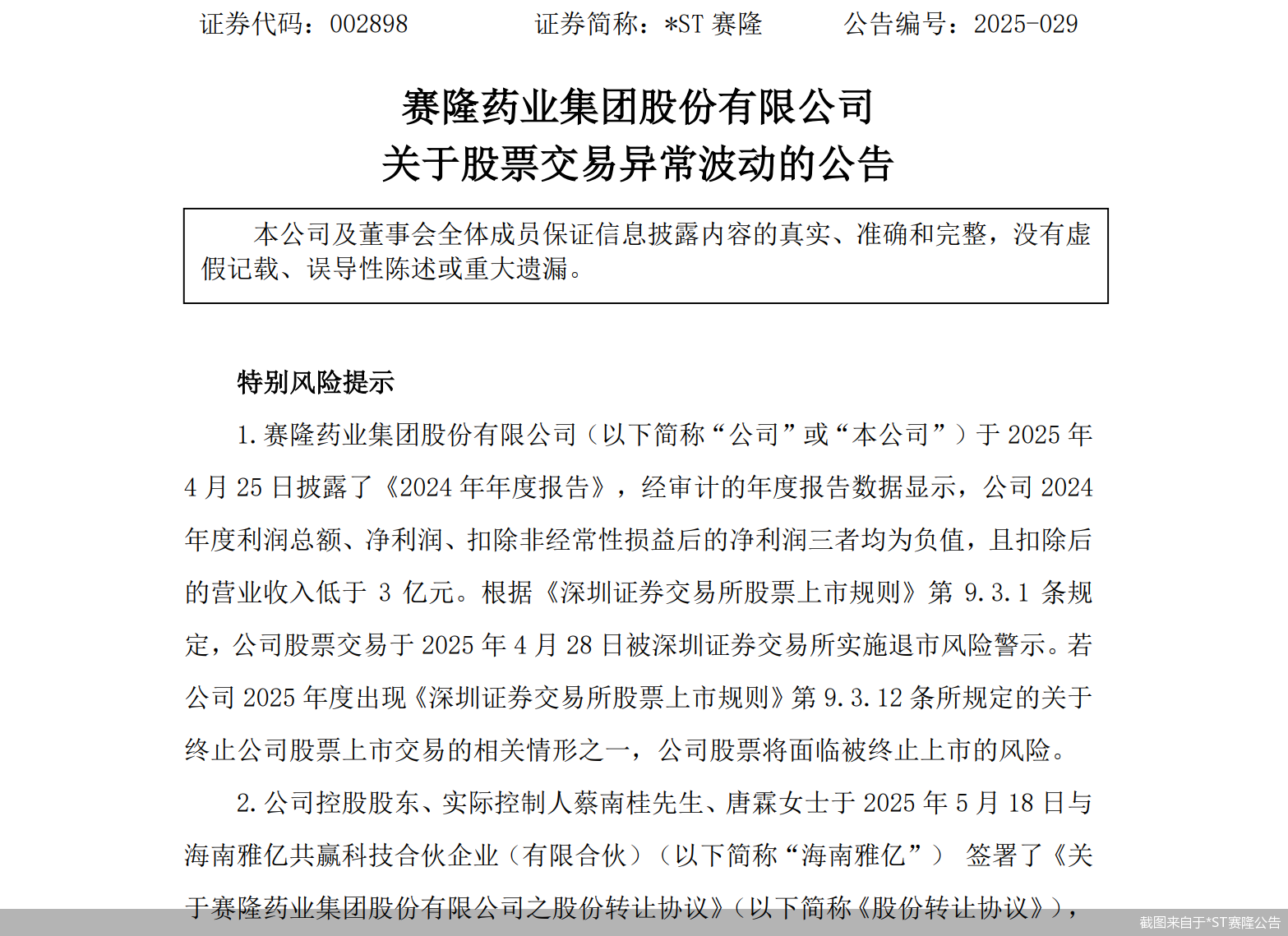 证券代码:002898 证券简称:*ST 赛隆 公告编号:2025-029 赛隆药业集团股份有限公司 关于股票交易异常波动的公告 本公司及董事会全体成员保证信息披露内容的真实、准确和完整,没有虚 假记载、误导性陈述或重大遗漏。 特别风险提示 1.赛隆药业集团股份有限公司(以下简称"公司"或"本公司")于 2025 年 4 月 25 日披露了《2024 年年度报告》,经审计的年度报告数据显示,公司 2024 年度利润总额、净利润、扣除非经常性损益后的净利润三者均为负值,且扣除后 的营业收入低于 3 亿元。根据《深圳证券交易所股票上市规则》第 9.3.1 条规 定,公司股票交易于 2025 年 4 月 28 日被深圳证券交易所实施退市风险警示。若 公司 2025 年度出现《深圳证券交易所股票上市规则》第 9.3.12 条所规定的关于 终止公司股票上市交易的相关情形之一,公司股票将面临被终止上市的风险。 2.公司控股股东、实际控制人蔡南桂先生、唐霖女士于 2025 年 5 月 18 日与 海南雅亿共赢科技合伙企业(有限合伙)(以下简称"海南雅亿") 签署了《关 于赛隆药业集团股份有限公司之股份转让协议》(以下简称《 ...
