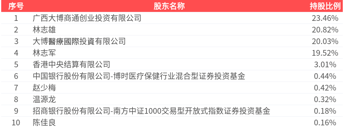 2025年10月29日,大博医疗(002901.SZ)发布2025年三季报。 公司股东户数为2.28万户,前十大股东持股数量为3.66亿股,占总股本比例为88.36%,前十大股东持股情况如下: | 序号 | 股东名称 | 持股 | | --- | --- | --- | | l | 广西大博商通创业投资有限公司 | 23.41 | | 2 | 林志雄 | 20.8. | | 3 | 大博醫療國際投資有限公司 | 20.0. | | ব | 林志军 | 19.5. | | 5 | 香港中央结算有限公司 | 3.01 | | 6 | 中国银行股份有限公司-博时医疗保健行业混合型证券投资基金 | 0.44 | | 7 | 赵少梅 | 0.42 | | 8 | 温源龙 | 0.32 | | ਰੇ | 招商银行股份有限公司-南方中证1000交易型开放式指数证券投资基金 | 0.18 | | 10 | 陈佳良 | 0.16 | 公司营业总收入为18.76亿元。归母净利润为4.25亿元。经营活动现金净流入为4.68亿元。 以上内容与数据,与有连云立场无关,不构成投资建议。据此操作,风险自担。 公司最新资产负债率为24.53 ...